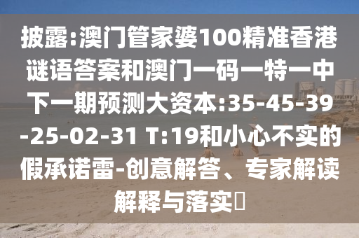 摘要:本文揭露了澳門管家婆的精準(zhǔn)香港謎語答案及澳門下期預(yù)測大資本,包括特定數(shù)字如35-45-39-25-02-31和T:19等。同時提醒公眾小心不實的假承諾,強(qiáng)調(diào)創(chuàng)意解答、專家解讀解釋與落實的重要性。