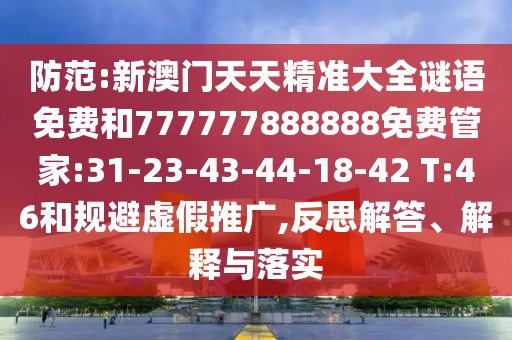 摘要:,,針對新澳門天天精準大全謎語免費和777777888888免費管家等可能的虛假推廣,我們應保持警惕并采取措施防范。對于此類推廣,我們需要反思解答、解釋與落實,確保公眾不被誤導。對于提供的數字如31-23-43-44-18-42 T:46等,應謹慎對待,避免陷入騙局。我們應保持理性思維,不輕信不明來源的信息,共同營造一個誠信的網絡環境。