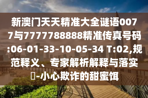 摘要:,,本內容提供新澳門天天精準大全謎語,涉及特定數字組合如0077和7777788888等。同時提供傳真號碼和可能的陷阱提示。內容包括謎語釋義、專家解析解釋以及防范欺詐的提醒。讀者需謹慎對待此類信息,以免受騙上當。