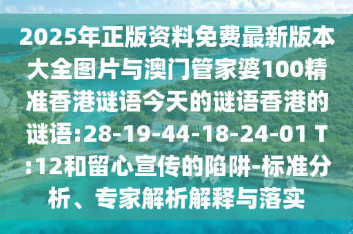 摘要:,,本文提供了2025年正版資料的免費最新版本大全圖片,包括澳門管家婆的精準香港謎語。文章介紹了今天的香港謎語,包括數字組合如28-19-44-18-24-01以及T:12等。同時提醒人們留心宣傳陷阱,并提供了標準分析、專家解析解釋及落實的建議。文章內容簡潔明了,旨在為讀者提供有用的信息和指導。